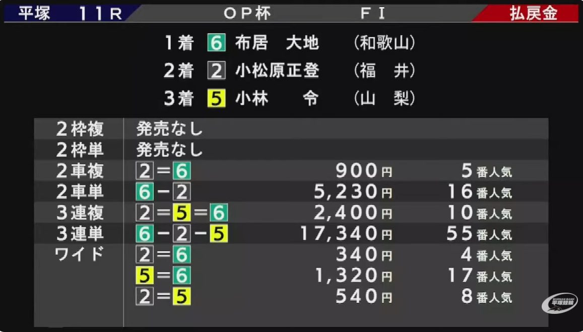 2着には②小松原選手、3着には終始冷静に脚をためていた5番車の小林令選手が入り、レースは3連単『6-2-5』での決着となりました。