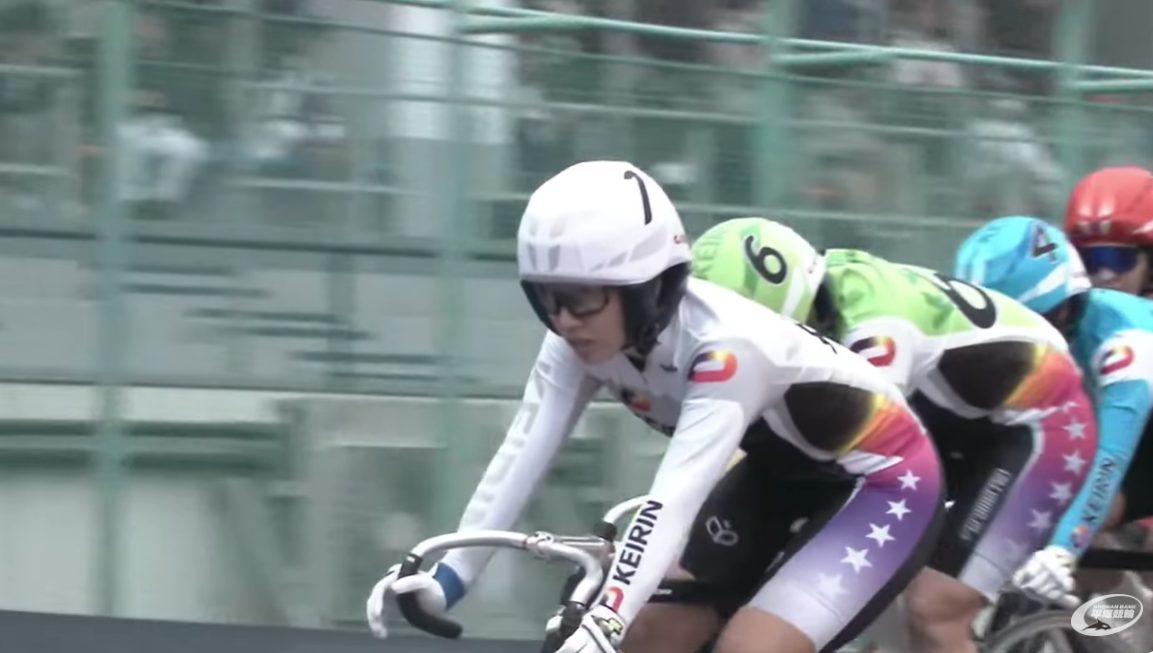 その、⑦佐藤選手の番手争いは激しく、内側から5番車の五味田奈穂選手、真ん中に1番車の久米詩選手、外側に6番車の奥井迪選手が並び、3車が横一線の攻防にから、最終2コーナーを迎えると⑤五味田選手が勢いよく捲りに出ます。それに反応した➀久米選手がスイッチし、さらにその後方から⑥奥井選手も続く形で一気にスピード戦へ。