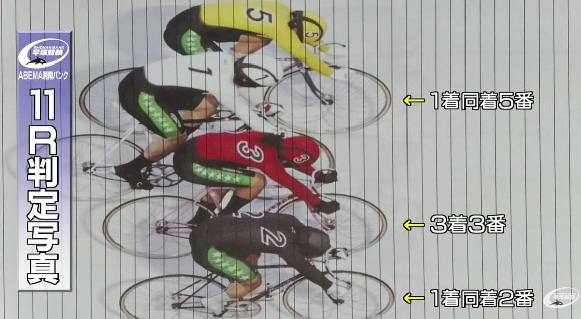 ⑤斉藤選手と並ぶようにゴールへ飛び込み、写真判定の末、1着同着という結果となりました。3着には、⑥今井選手をマークしていた3番車の高橋昇平選手。