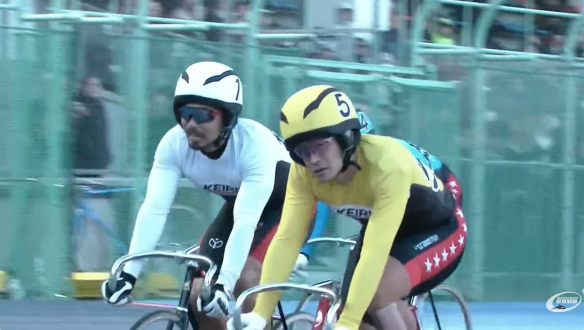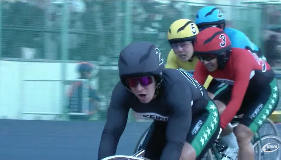 その際、②北井選手の番手を回っていた7番車の伊豆田浩人選手が離れてしまい、③長松選手が②北井選手の番手にハマる展開となりました。