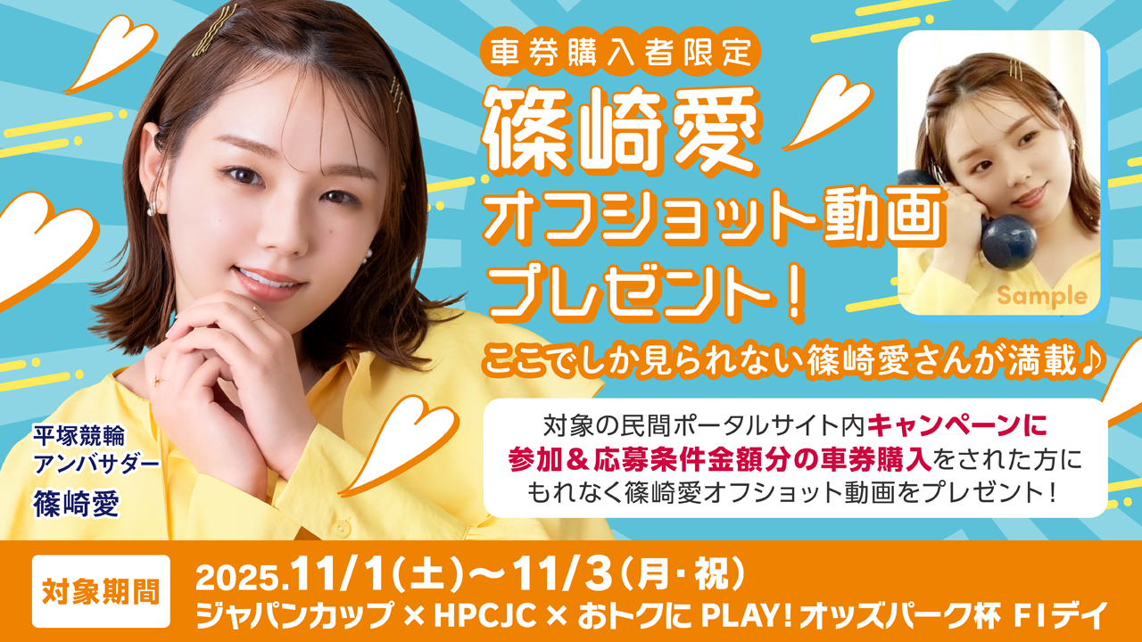 • 対象のポータルサイトで実施されている、「11月1日(土)~11月3日(月祝) 『ジャパンカップ×HPCJC×おトクにPLAY!オッズパーク杯』(FⅠデイ)」を対象とした、キャンペーンに参加&参加条件を達成された方に、もれなく、令和7年度平塚競輪アンバサダー「篠崎愛」のオフショット動画をプレゼントいたします。