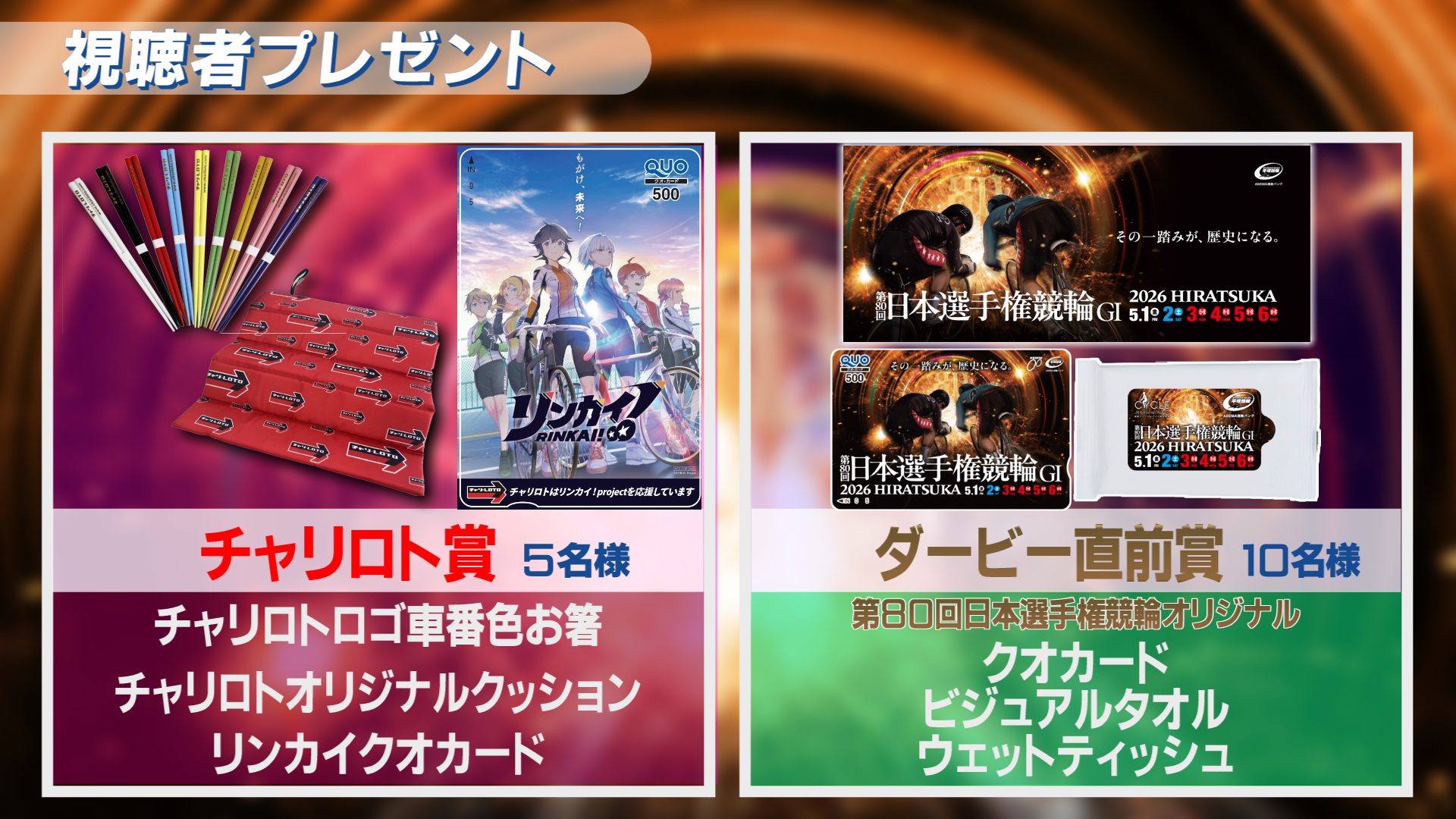 ※チャリロト賞のプレゼントは株式会社チャリ・ロト様よりご提供いただいております。