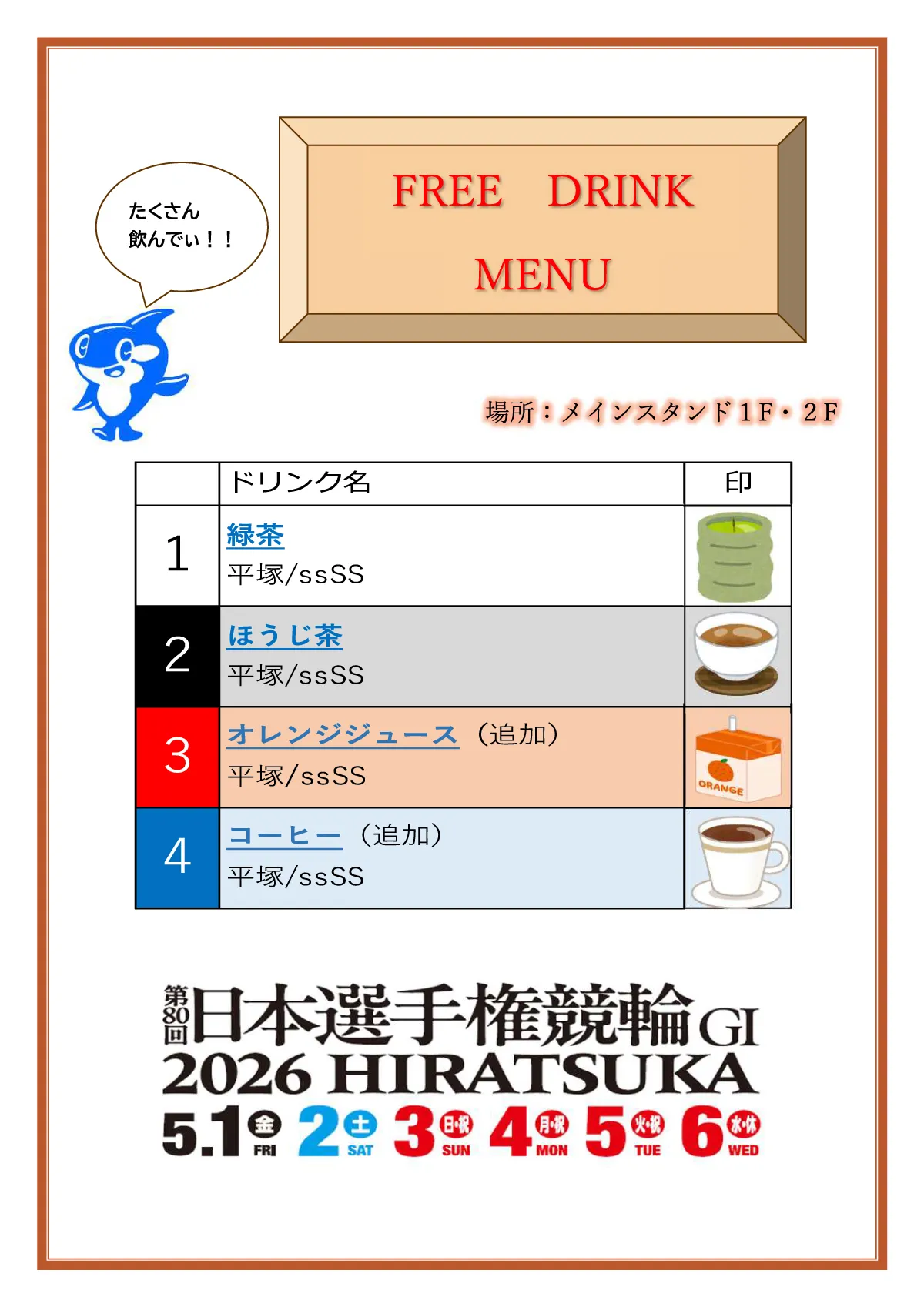 5月1日~6日の日本選手権競輪期間中限定で、無料ドリンクコーナーにオレンジジュース&コーヒーが登場します!限定ドリンクを飲みながら、イベント盛りだくさんの日本選手権競輪をお楽しみください!